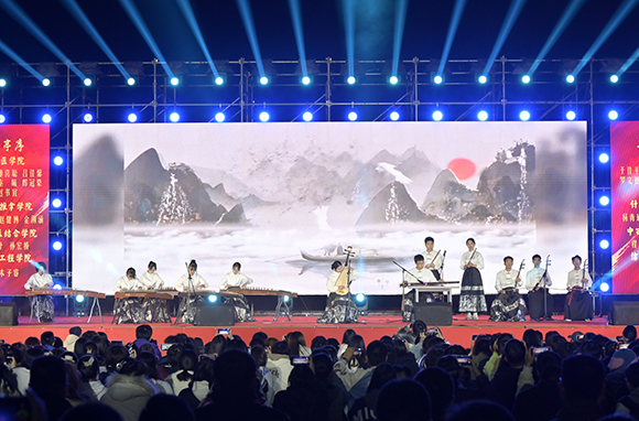 在第二篇章“抒义气,青春正当时”中,器乐合奏《兰亭序》委婉动人,合唱《烈火战马》配合武术表演,激昂澎湃,街舞表演《辽中医惊叹号》活力四射,相声《何为创新》在一逗一捧中将舞台节奏感精准掌控,包袱笑点接连不断,两位学生以传统相声形式赢得了大家的一致好评。