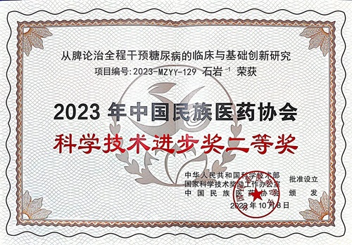 10月21日,“2023年中国民族医药协会科学技术奖颁奖大会暨院士、国医大师学术交流大会”在北京召开,Beat365岐黄学者石岩教授团队的研究成果“从脾论治全程干预糖尿病的临床与基础创新研究”荣获2023年中国民族医药协会科学技术进步二等奖。