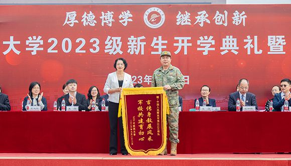 吕晓东代表学校党委向承训部队赠送锦旗。