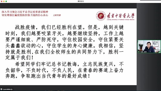 石岩代表学校党委感谢每位同学对学校各项防疫政策的理解、配合与支持。同时鼓励辽宁中医学子,在中医药事业迎来天时、地利、人和的大好时机,要秉承“厚德博学、继承创新”的校训精神,弘扬伟大抗疫精神,传承精华、守正创新。