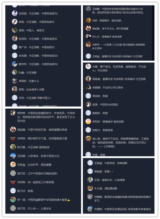 课程结束后,依然有同学在网上与老师互动。大家激动地表示作为中医学子一定不负祖国的期望、学校的关怀,将自己的中医梦融入到伟大中国的健康梦中,用青春书写中医篇章,用实干助力中医梦想,在复兴中医药文化中贡献自己的青春力量。
