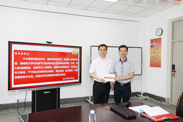 2021年7月1日,恰逢中国共产党百年华诞,学校纪委书记、监察专员张洪新同志专程到现场,为继续教育学院院长李海权同志和马克思主义学院副院长陈吉庆同志送去“政治生日”廉洁贺卡,一同回忆入党时的心路历程,在诚挚祝福的同时,也温馨提示他们:时刻牢记入党誓词,严守政治纪律和政治规矩,绝对忠诚、坚守底线,永葆清廉的政治本色。