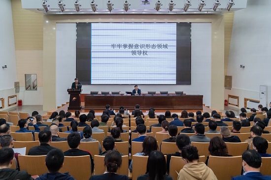 5月12日,学校举办意识形态工作培训会,邀请省委宣传部政策法规处处长章瑞作题为《牢牢掌握意识形态工作领导权》辅导报告。学校领导班子成员,副处级以上中层领导干部,全校辅导员,专职、兼职组织员,马克思主义学院全体教师200余人参加了报告会。
