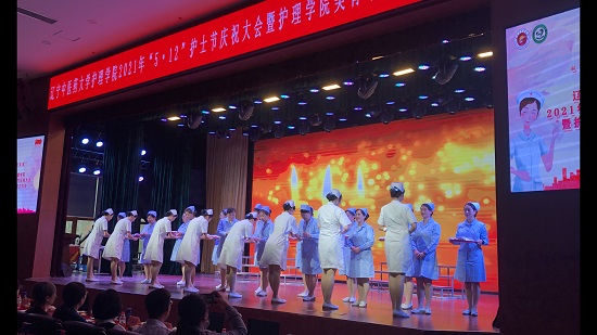 大会以舞蹈《芳华》拉开帷幕。会上,护理学院党总支书记张宁苏致辞,代表护理学院全体师生对领导和嘉宾的莅临表示热烈欢迎,总结了近年来护理学院全体师生取得的成绩,阐释了成立美育中心的目的和意义,对学院发展辛勤付出的各位老师、致力于护理事业的护理学子表达了节日祝贺。在表彰环节,沈阳中心血站党委书记栾燕为护理学院授予了“沈阳市无偿献血优秀组织奖”。沈阳市皇姑区团区委战线部负责人李想为护理学院皇姑青年突击队颁发“皇姑区青年五四奖状”。护理学院副院长王妍宣布2021年度“护理学院优秀校友”名单并聘任她们担任“护理学院就业大使”的决定。学校教学督导副组长田静、招生就业处处长陈冰为优秀校友代表颁发证书。之后进行了庄严的授帽仪式,授帽嘉宾由护理学院领导、教师和学校各附属医院护理部主任代表、抗击新冠疫情英雄护理部科护士长代表组成,授帽仪式后全体学生进行《南丁格尔誓言》宣誓。