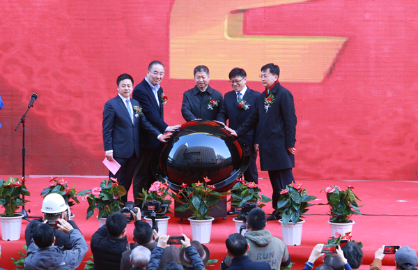 伴随着礼炮声声鸣响,曾庆捷、石岩、代贵雪、杨鸫祥、于永铎共同按下启动按钮,金沙与混凝土一起被注入项目建筑最高点,大楼主体结构正式封顶。