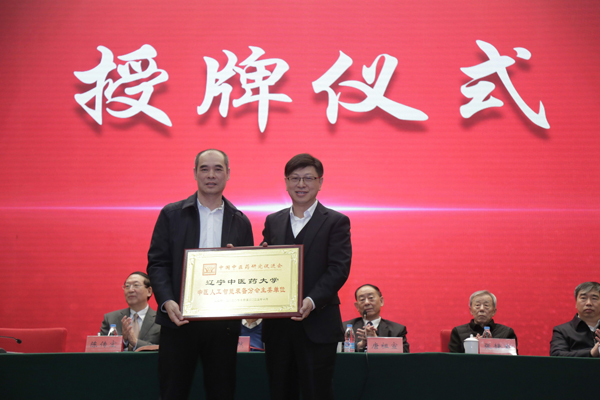 (中国中医药研究促进会常务副会长高武向校长石岩颁发主委单位牌匾)