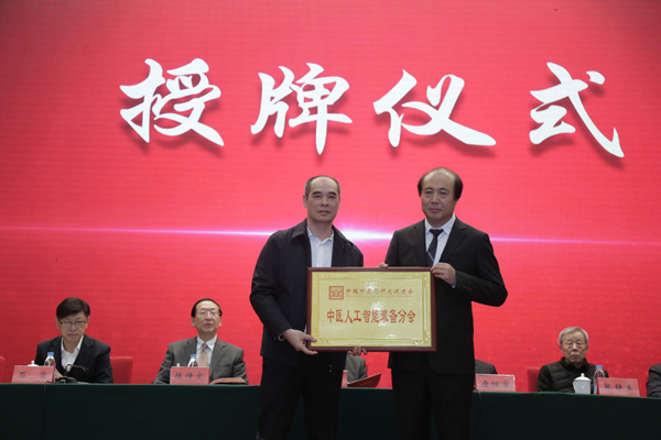 (中国中医药研究促进会常务副会长高武向中医人工智能装备分会首届会长许斌颁发分会牌匾)