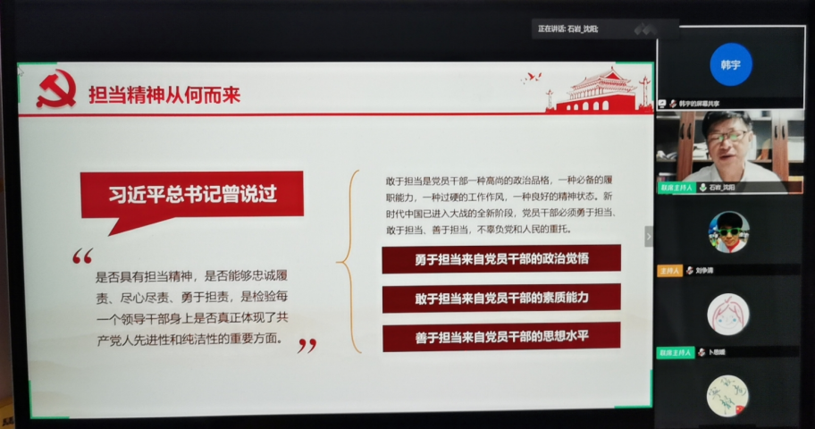 4月30日晚7点,为巩固“不忘初心、牢记使命”主题教育成果,确保“三会一课”标准化常态化,在疫情防控的特殊时期,校长石岩采用线上方式为所在支部全体党员讲授云端党课,党课题目为“敢担当有作为,筑梦新时代”。