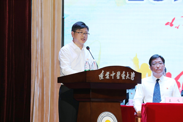 随后,研究生学院院长任路对新生代表2019级硕士研究生李依诺同学进行授旗,该生代表全体新生进行发言:当代中医药学子应勇担历史重任、坚守中医初心、完成中医使命、传承中医精神。2017级硕士研究生于睿智同学代表在校生发言,祝愿新同学将理论学习、学术研究和临床实践的有机结合,开拓学习思路,把握研究关键,以百倍的信心和万分的努力谱写更加美好的明天! 在校旗和院旗的见证下,2019级硕士研究生周子齐同学带领全体研究生高举右拳庄严宣誓,表明了作为中医药学子牢记校训精神、谨遵中医使命!