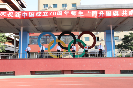 两千名师生,高举国旗,共同唱响《歌唱祖国》。伴随着激昂的歌声,学生公寓旗帜飞舞,7名轮滑同学手执国旗随风飘扬,70名同学组成的旗海红潮涌动。随着歌声渐入高潮,巨幅国旗从博物馆楼顶飞腾而下,全体师生高呼:伟大祖国,生日快乐,繁荣富强!