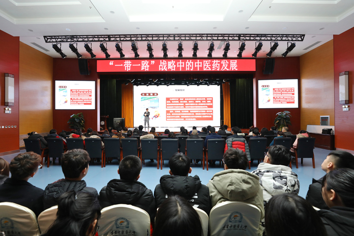 12月5日,校长石岩为学生上“形势与政策”课,系统地为学生讲解了“一带一路”倡议中的中医药发展。宣传统战部部长周健、团委书记李睿、研究生学院党总支书记王飞、学生处副处长刘英佶、信息工程学院副院长刘广、外国语学院副院长潘海鸥、各学院辅导员以及600名学生代表共同聆听了一堂意义深远的“形势与政策”课。