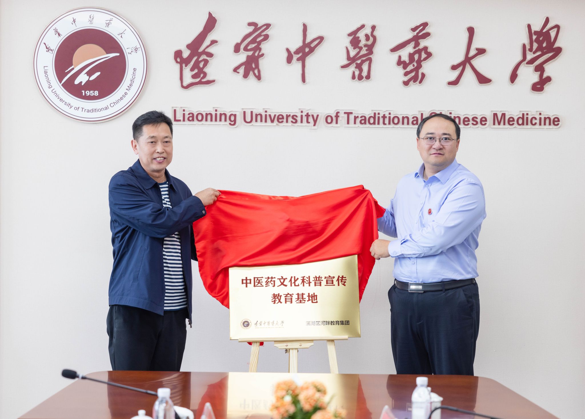 学校党委副书记刘继东,溪湖区河畔教育集团校长高升共同为“中医药文化科普宣传教育基地”揭牌