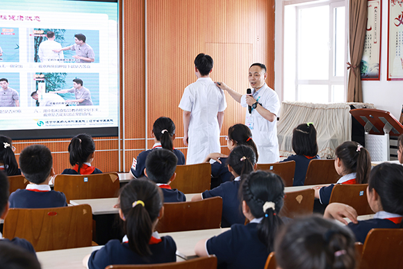 首先,骨伤一科医生孙广江为同学们讲授了一节“守护脊柱健康”课,帮助学生们认识脊柱,了解造成脊柱侧弯的原因、脊柱侧弯的危害,认识筛查脊柱健康状态的必要性。孙广江为同学们示范了正确的坐姿、站姿、睡姿,重点讲授了脊柱侧弯的预防举措。随后,学生们在护士张苗的带领下,习练了传统养生功法——八段锦,对脊柱进行有效的锻炼,通过面对面的讲解和实践,孩子们在轻松愉悦的氛围中感受中医药文化的魅力。