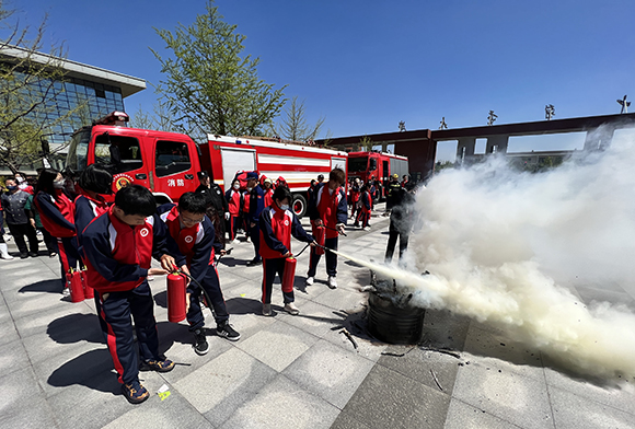 消防指战官兵对消防车及消防设备进行了详细讲解,让广大师生了解了火灾发生后各阶段的不同处置方式。随后进行了消防水枪灭火演练、灭火器灭火教学及现场演练。