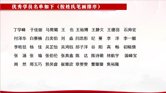 随后,优秀学员代表林航宇、杨佳和付泽华结合自身经历分享了参与青马理论学苑的巨大收获,大家纷纷表示青马理论学苑是一个有深度、有温度、积极向上、思想先进的一个大家庭,结业在即,内心万分不舍,但“纵有四海,横有八荒,前途似锦,来日方长。”刘娜老师代表全体班主任发言,她表示本次结业仪式采用线上的形式开展,结业之后,希望全体学员离线但不离场。首先,马克思主义不离场,同学们要学会用科学的理论和批判的武器思考问题;其次,青马学员的身份和责任担当不离场,既然选择了天使白就要肩负起自己的使命和担当!正如习近平总书记在中国人民大学调研考察时寄语青年:“我们要在青春的赛道上奋力奔跑,争取跑出当代青年的最好成绩。”