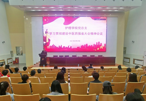 9月29日,护理学院党总支在学术报告厅召开理论学习中心组扩大学习暨学习贯彻建设中医药强省大会精神会议,沈阳校区护理学院全体师生党员、入党积极分子代表现场参加会议,本溪校区师生党员线上参加会议。会上,学院党总支书记张宁苏发表讲话,党总支副书记葛骁欧解读《关于大力促进中医药传承创新发展建设中医药强省的实施意见》,会议由党总支组织委员、副院长王妍主持。