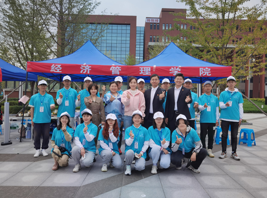 在新生报到的主要地点——岐黄广场,经济管理学院设置了专门的引导摊位,负责收取新生的报到材料,发放新生大礼包并引导新生有序完成报道流程。
