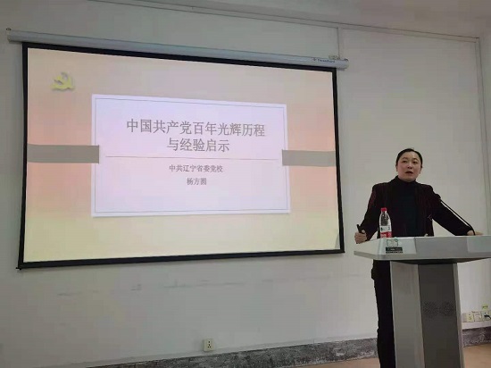 党史学习教育专题读书班“党课开讲啦”第一期党课邀请到辽宁省委党校党史教研部副教授杨方圆为学院师生党员讲授专题党课。杨教授以“中国共产党百年光辉历程与经验启示”为题,以高度的政治站位、深厚的理论素养和丰富的实践经验,从峥嵘岁月中国共产党百年光辉历程和不忘初心中国共产党百年经验启示两大方面深入讲解党的百年历史和先进经验。杨教授结合鲜活事例,逻辑严密、重点突出,深入浅出的分析了党的百年征程,从浴血奋战的革命时期,激情燃烧的建设时期,到波澜壮阔的改革时期,再到如今意气风发的筑梦路上,中国共产党百年的辉煌历史一幕幕呈现在师生党员的眼前。并进一步讲解了中国共产党百年的丰富经验,一是坚持科学的理论作为指导思想,坚定不移的走自己的路;二是坚持以人民为中心的治国之本,坚定不移的为民服务;三是坚持国情把握时代潮流,坚定不移的走在时代前列;四是坚持党的领导,加强党的建设。使党员们对党的历史、党的科学理论和先进经验有了更深入的理解和感受。