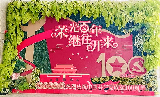 同时,图书馆以“荣光百年 继往开来”为主题制作中国共产党成立100周年文化墙,将图书馆大厅打造成党建文化宣传阵地,让师生耳濡目染感受建党百年的文化气息,通过增强仪式感和参与感,营造团结奋进、开辟新局的浓厚氛围,为建党百年献礼。