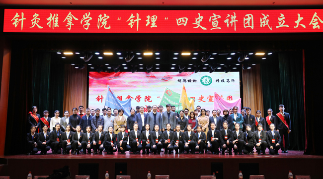 12月4日,针灸推拿学院“针理”四史宣讲团成立大会在学校大学生活动中心举行。学校党委组织部部长刘继东、学生工作处处长徐晓东、副处长范艳、招生就业处处长陈冰、副处长曲宁宁、马克思主义学院党总支书记马其南、副院长陈吉庆、针灸推拿学院领导班子、全体教师党员以及2018级,2019级,2020级全体同学出席了本次大会。大会由针灸推拿学院周思宁主持。