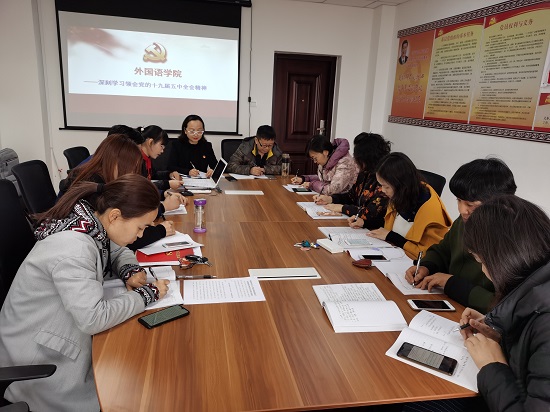 为深入学习贯彻党的十九届五中全会精神,准确把握全会的精神实质和重大部署,外国语学院党总支组织全体党员开展专题学习。