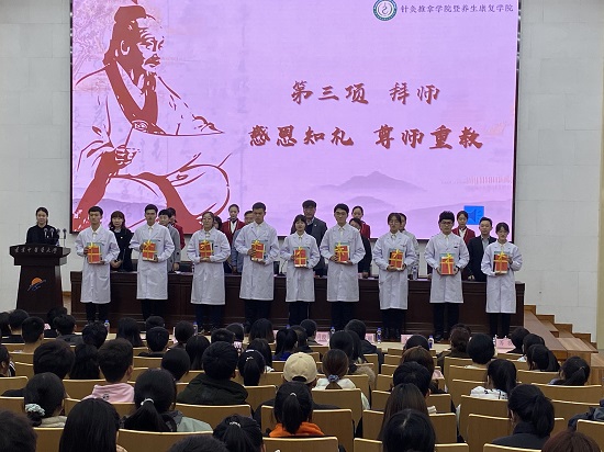 在“拜师”环节中,新生代表向老师们敬赠拜师帖,行拜师礼,老师们为新生代表佩戴校徽、赠送师回礼。在“师说——专家教授与你面对面”环节中,领导班子和专家教授为新生送上寄语,表达了学术上的期许和生活上的嘱托:马铁明院长表示,不管道路多么漫长都要一步一步走下去,实现人生价值;孙兆姝书记表示,学校承载着每个人的梦想与未来,希望全体新生在大学生活期间以梦想为力量,圆梦大学,圆梦辽中医;针灸临床教研室主任王颖教授希望同学们每天的学习都有收获,坚持学习中医,坚持学术思想;吴兆利教授鼓励同学们要德智体美全面发展,让同学们的智慧得以绽放和发光,完善专业才能有能力完善人生梦想;王巍教授希望同学们能够珍惜大学宝贵时光,勤奋学习,实现人生理想;针灸基础教研室王淑娟教授希望同学们能够树立理想和目标,建立自信,开启新生活;董宝强副院长祝愿全体新生在大学能够学好专业技能,努力成长成才;刘旭来副院长希望同学们能够在大学期间充分利用学习时间,学习专业知识,报答社会;陈艳萍副书记希望大家能够勇敢追求理想,追求真理,永无止境。