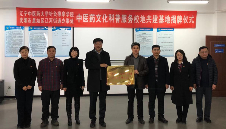 为深入开展“不忘初心、牢记使命”主题教育,学习贯彻习近平新时代中国特色社会主义思想和党的十九届四中全会精神,进一步贯彻落实全国中医药大会精神及《中共中央国务院关于促进中医药传承创新发展的意见》,11月14日,针灸推拿学院与沈阳市皇姑区辽河社区开展合作共建活动,共建基地揭牌仪式在辽河街道办事处举行。皇姑区委组织部副部长何长江、辽河街道办事处党工委书记谢冰、针灸推拿学院院长马铁明、党总支书记孙兆姝、副院长董宝强、党总支副书记陈艳萍以及学院全体教师党员、大学生党员代表、功法队代表和各社区代表等近百人参加了揭牌仪式。并在揭牌仪式后,开展了主题党日活动,为现场百姓进行义诊服务。