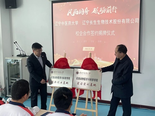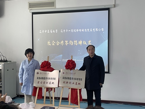 3月20日下午,实验动物医学与科学学院与辽宁长生生物技术股份有限公司、辽宁千一测试评价科技发展有限公司举行校企合作揭牌仪式。学院院长王春田和辽宁长生公司总经理王洪梁、辽宁千一公司总经理王智琴博士分别代表双方共同为学院“实习实训基地”、“创新创业基地”揭牌。辽宁长生公司市场部经理任娇、辽宁千一公司经营管理总监左超、学院副院长周阳、吴运谱、办公室主任宁天一、全体学业导师及2023级实验动物学学生参加揭牌仪式。