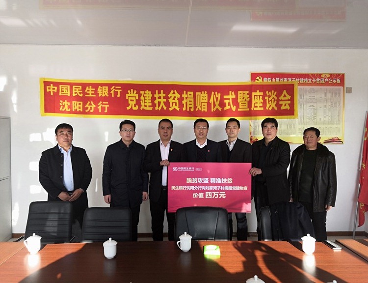 为不断加强贫困地区基层党组织建设,持续夯实贫困地区党建工作基础。去年11月开始,学校驻村干部赫军经过多次与辽宁省扶贫办沟通,已与中国民生银行沈阳分行党委达成帮扶意向。今年1月13日,在阜蒙县蜘蛛山镇刘家湾子村的党群活动中心,举行了中国民生银行沈阳分行“党建扶贫捐赠仪式”,仪式上,民生银行沈阳分行捐赠价值四万元的办公用品、书籍等物资,专项用于新建成的党群服务中心中基础建设。蜘蛛山镇镇长杨宁、蜘蛛山镇党委副书记赵虹桥、刘家湾子村第一书记赫军、民生银行沈阳分行行长兼党委副书记(主持工作)程清亮、副行长戴长春、党委组织部负责人周橹、以及蜘蛛山镇党委相关领导参加了捐赠活动。