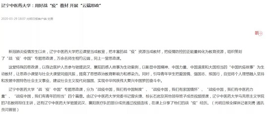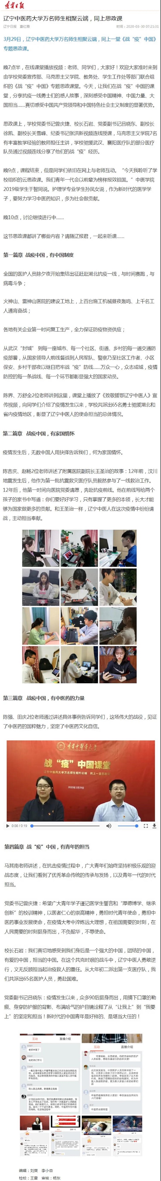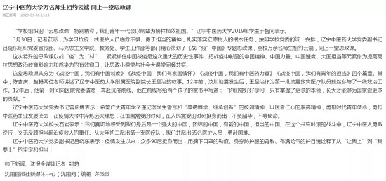3月29日19:30,全校万余名师生相约云端,同上一堂思政课。广大师生积极留言、热切谈论,4.5万余人点赞。人民网、光明日报、辽宁日报、沈阳日报、中国焦点在线、辽宁大学生在线联盟、云盛京、二三里资讯等多家媒体进行了深入采访报道,对这次网络思政课给予了高度评价。