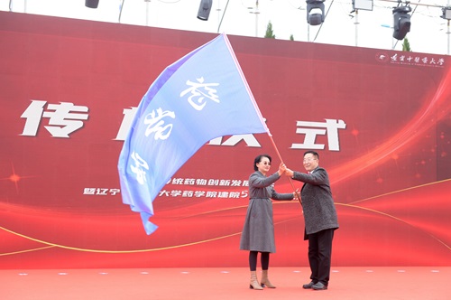 会上,举行了药学院院旗传旗仪式,吕晓东为药学院1977级校友康廷国授院旗。随后,1977级校友王峥涛、1978级校友门启鸣、1980级校友谢明、1981级校友赵光燃、1984级校友孟宪生、1986级校友王景刚、1991级校友才谦、1993级校友孙立夫、2008级校友颜鑫、药学院现任院长窦德强进行了院旗传递。
