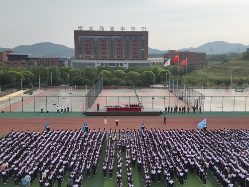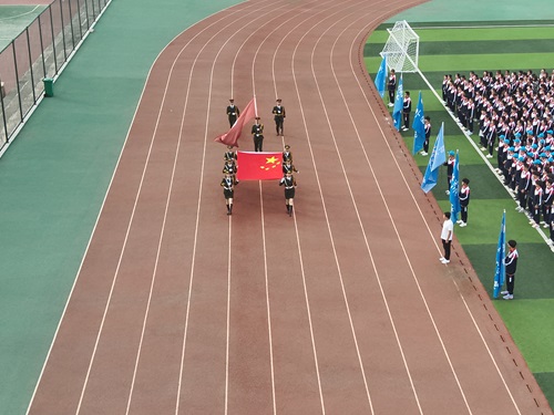 早7时整,升旗仪式正式开始。学校国旗护卫队迈着整齐划一、铿锵有力的步伐护送国旗、校旗、校徽旗入场。五星红旗伴随着庄严的国歌,校旗和校徽旗伴随着校歌冉冉升起。