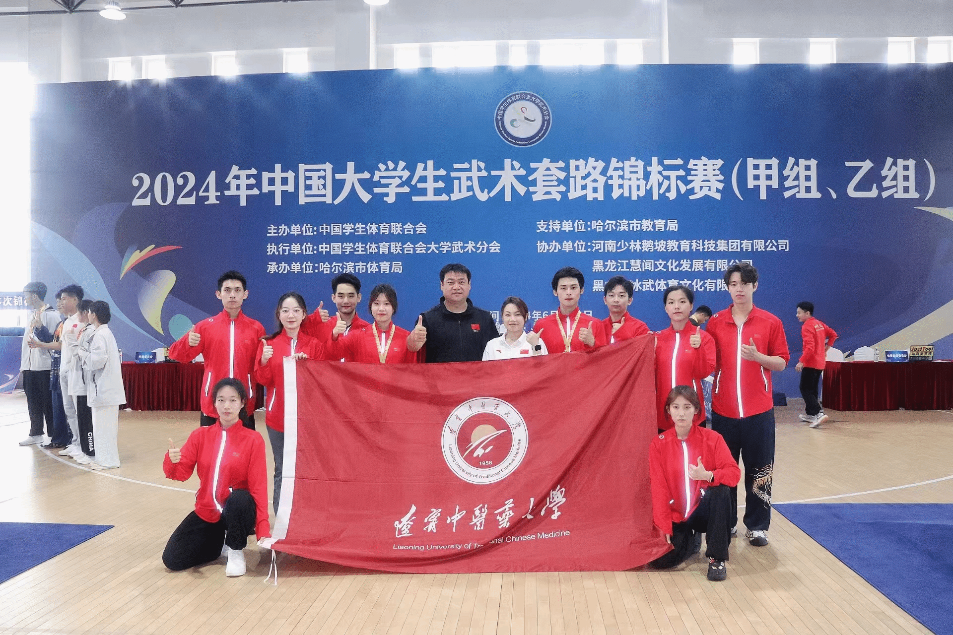 2024年中国大学生武术套路锦标赛(甲组、乙组)于6月8日下午,在哈尔滨华德学院体育馆落下帷幕。本次赛事以“青春热血、武动乾坤”为主题,由来自全国256所高校,1500余名大学生运动员参加。经过学校武术队严格选拔,Beat365共派出10名武术队员参赛,比赛由体育部主任吴俊琦领队,教师李岳和陈胜楠指导。经过6天的激烈比赛,Beat365运动健儿取得1金1铜的优异成绩。