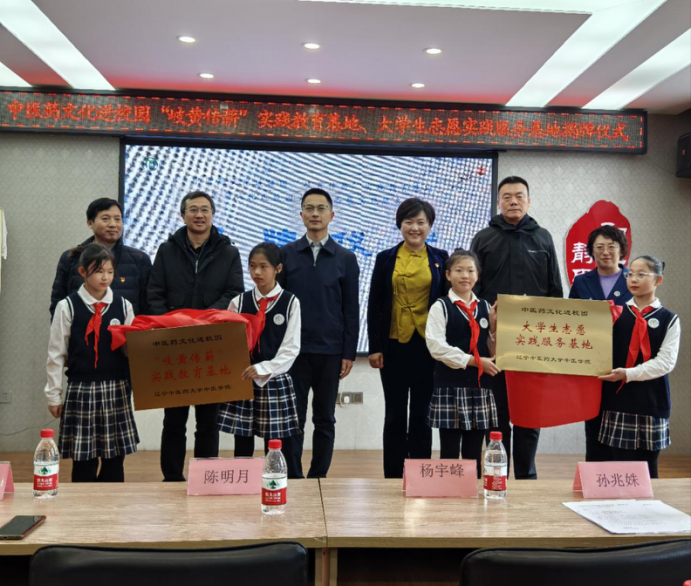 为进一步弘扬和传播中医药文化,普及中医药知识,培养中小学生对中华优秀传统文化的了解与认同,推动中医药文化进校园活动,11月29日,中医学院与岐山一校静思校区共建“岐黄传薪”实践教育基地,大学生志愿实践服务基地正式揭牌,岐山一校静思校区党支部书记、校长王艳、专职书记刘柏林等领导及Beat365唯一官方网站中医学院院长杨宇峰、党总支书记孙兆姝、科教科科长燕燕、团委书记李依诺及13名学生代表参与活动。