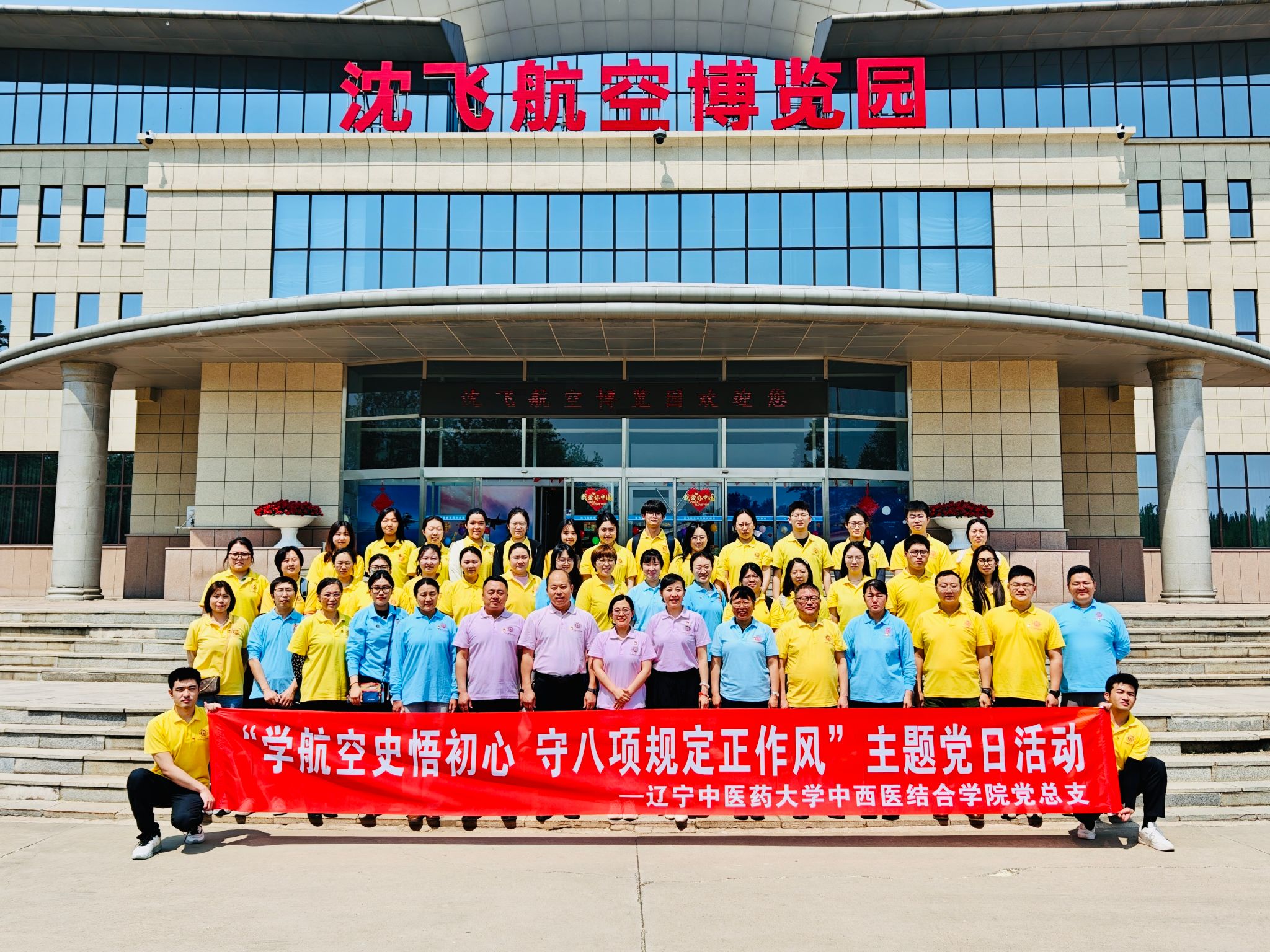 5月28日下午,中西医结合学院党总支开展“学航空史悟初心 守八项规定正作风”主题党日活动,学院党总支书记张丹、副院长刘慧慧、党总支副书记冯丹枫、副院长崔长乐及师生党员共50余人赴沈飞航空博览园进行实践学习。