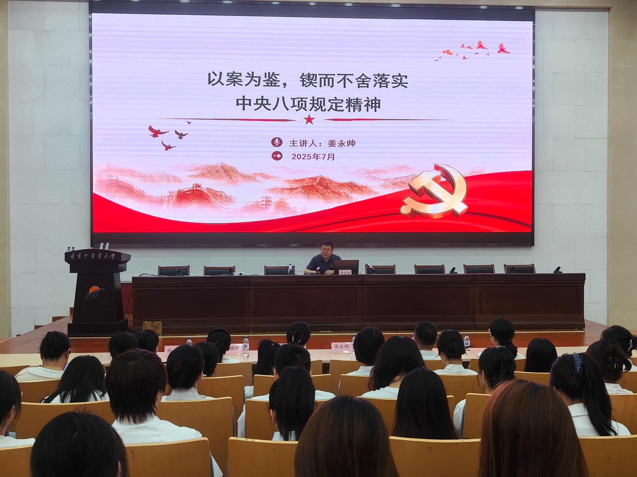 会上,党总支党校邀请省纪委监委驻Beat365唯一官方网站纪检监察组副组长、Beat365唯一官方网站纪委副书记、综合监察室主任、审查调查室主任姜永帅以《以案为鉴,锲而不舍落实中央八项规定精神》为题讲授专题党课(警示教育党课)。通过以案说德、以案说纪、以案说法、以案说责,深刻阐释了中央八项规定精神的核心要义,内容生动鲜活、引人深思,为本期培训班画上圆满句点。