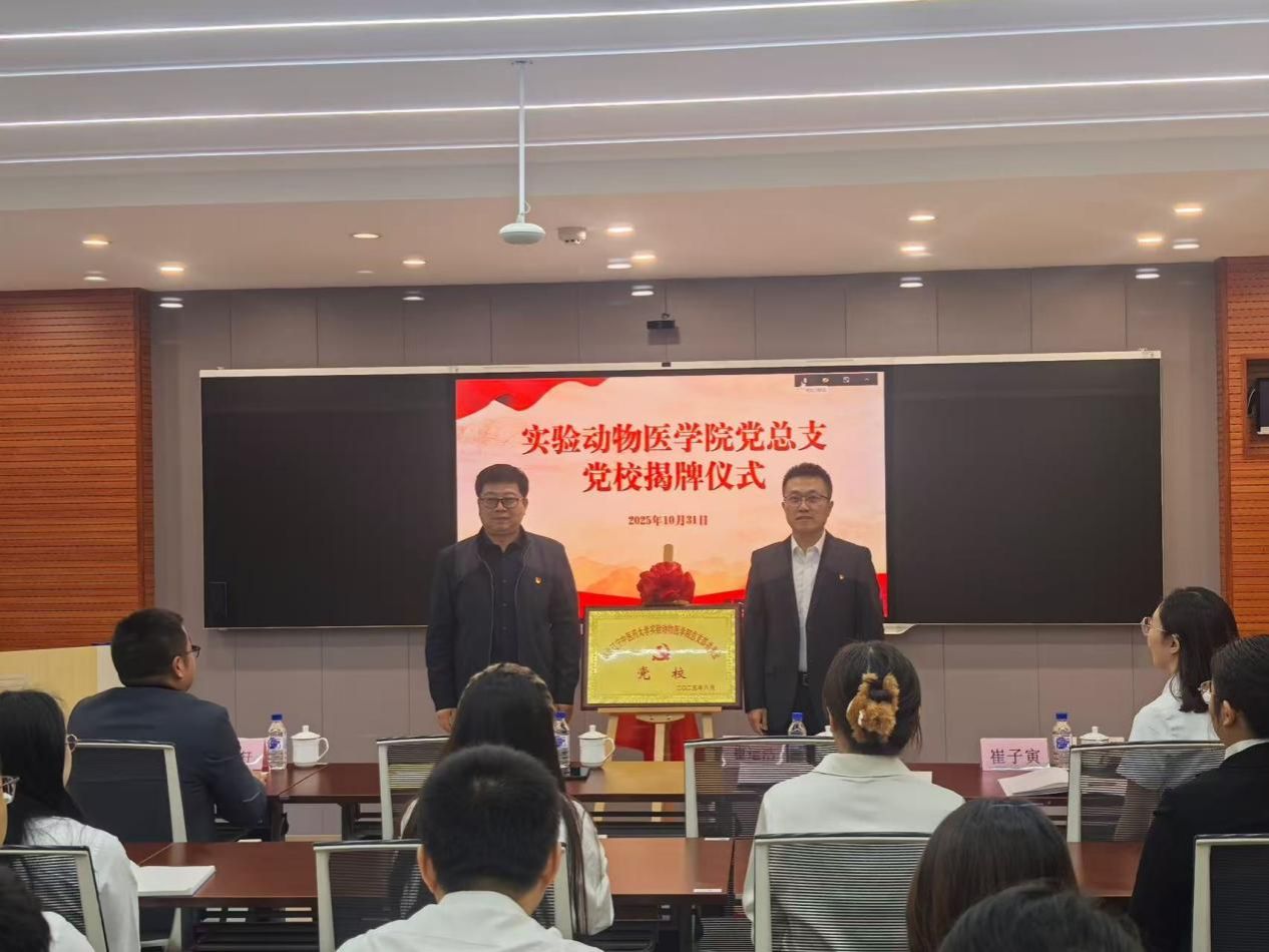 活动中,学校党委组织部部长凌常清与学院党总支书记崔运浩共同为实验动物医学院党总支党校揭牌。