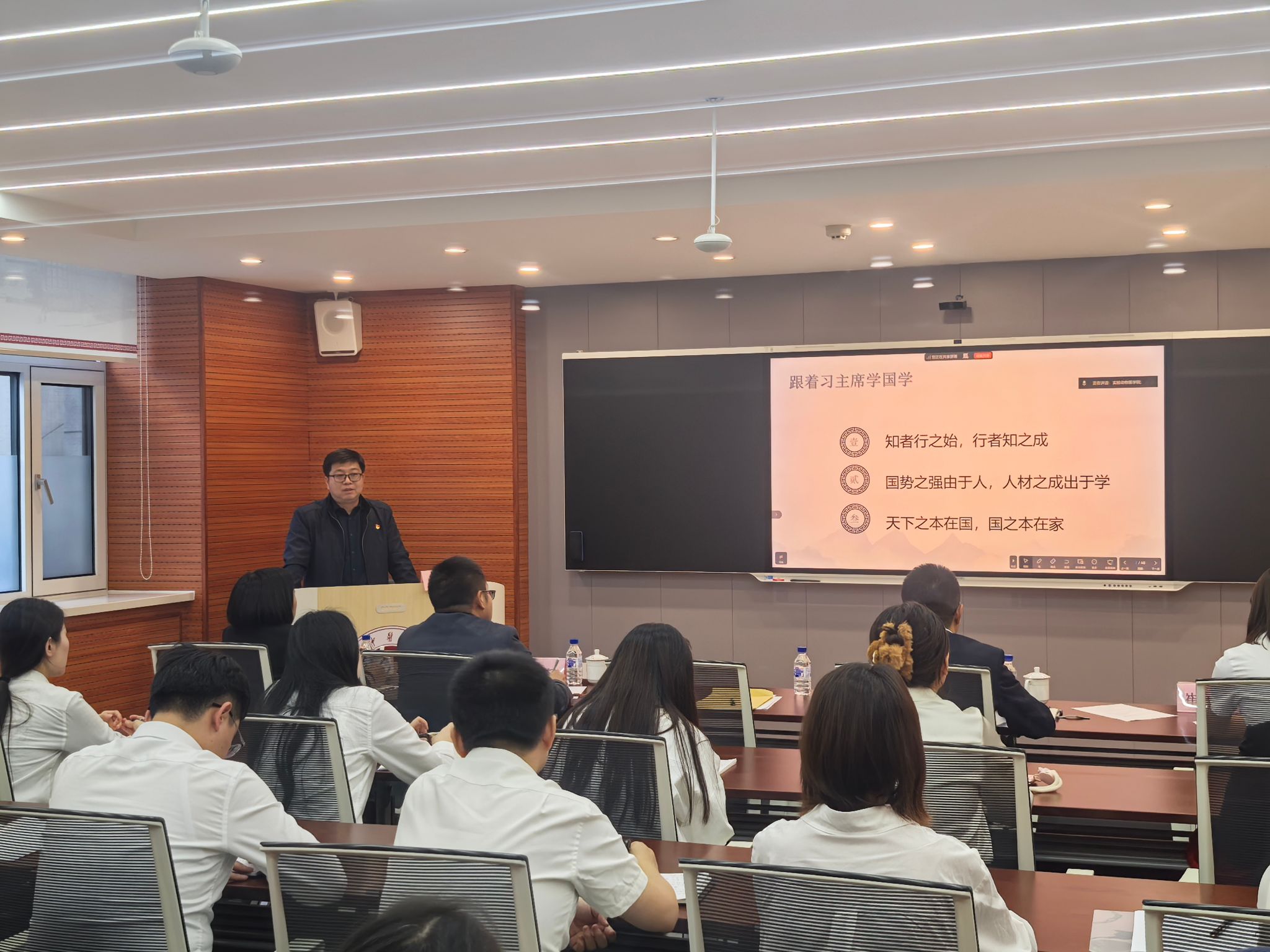 揭牌仪式后,学院党总支党校开展了党课培训,邀请凌常清为学院师生党员和入党积极分子讲党课,为学院大一新生做入党启蒙教育。凌常清以跟着习近平总书记学国学为题,深入浅出地阐述了“知者行之始,行者知之成”“国势之强由于人,人材之成出于学”“天下之本在国,国之本在家”三句话的历史背景、深刻含义与时代内涵,帮助师生从中领悟中华优秀传统文化的深刻内涵与智慧,树立崇高的理想信念。