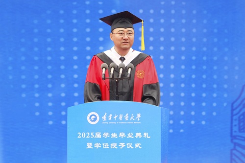 硕士研究生张家豪带领全体毕业生重温《大医精诚》誓言,铿锵有力的声音深深镌刻在每一位即将踏上人生新征程的学子心中。博士研究生梁元钰代表全体毕业生发言,表示将秉承“厚德博学,继承创新”的校训精神,努力书写“中医药大有可为、大有作为”的新篇章。外国来华留学毕业生代表刘宝分享了自己的成长经历,表达了对母校和老师的诚挚感谢,未来将让更多人了解、信任、受益于中医。在校生代表栾祥威向毕业生送上诚挚祝福,表示将以优秀的学长、学姐为榜样,努力成为有深厚底蕴、有仁爱之心、有担当之勇的新时代中医人。