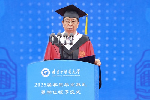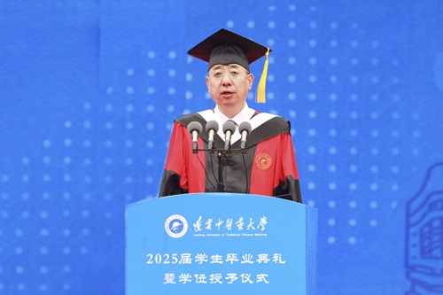教师代表窦德强为全体毕业生送上祝福及期望,他希望同学们始终牢记“厚德博学,继承创新”的校训精神,将大学期间所学内化于心、外化于行,永远记得“我们是辽中医人”这一母校送给大家最珍贵的礼物;希望大家在未来的道路上自信、坚定、勇敢地接受挑战,做到“历久弥新,不忘初心,方得始终”;更愿大家勇于奔赴党和国家最需要的地方,用辽中医人的担当和勇气,让中医药文化与世界同频共振,永远年轻,永远不知畏惧,永远热泪盈眶,归来仍是少年!