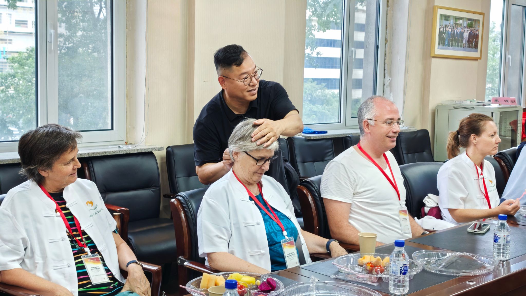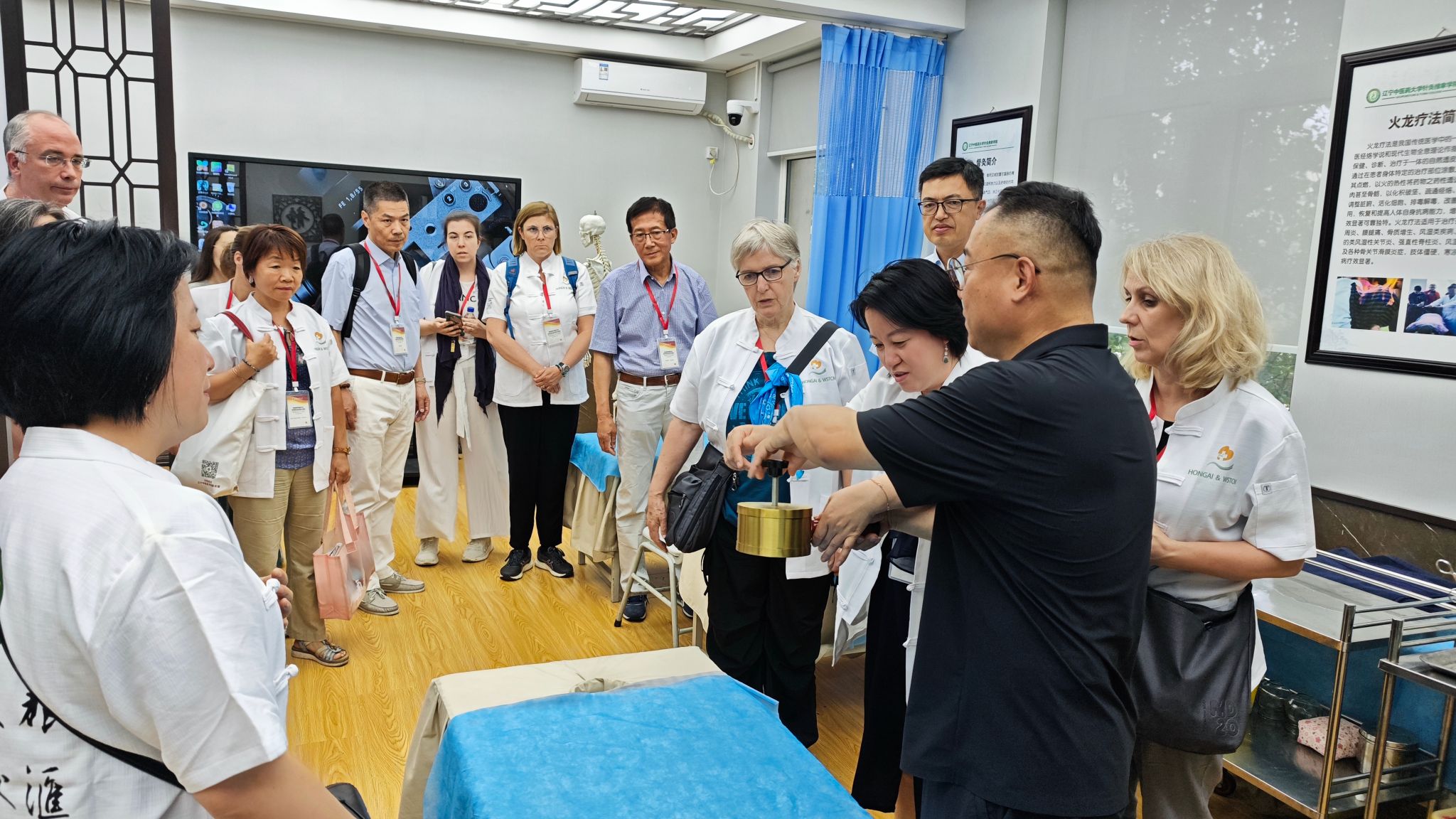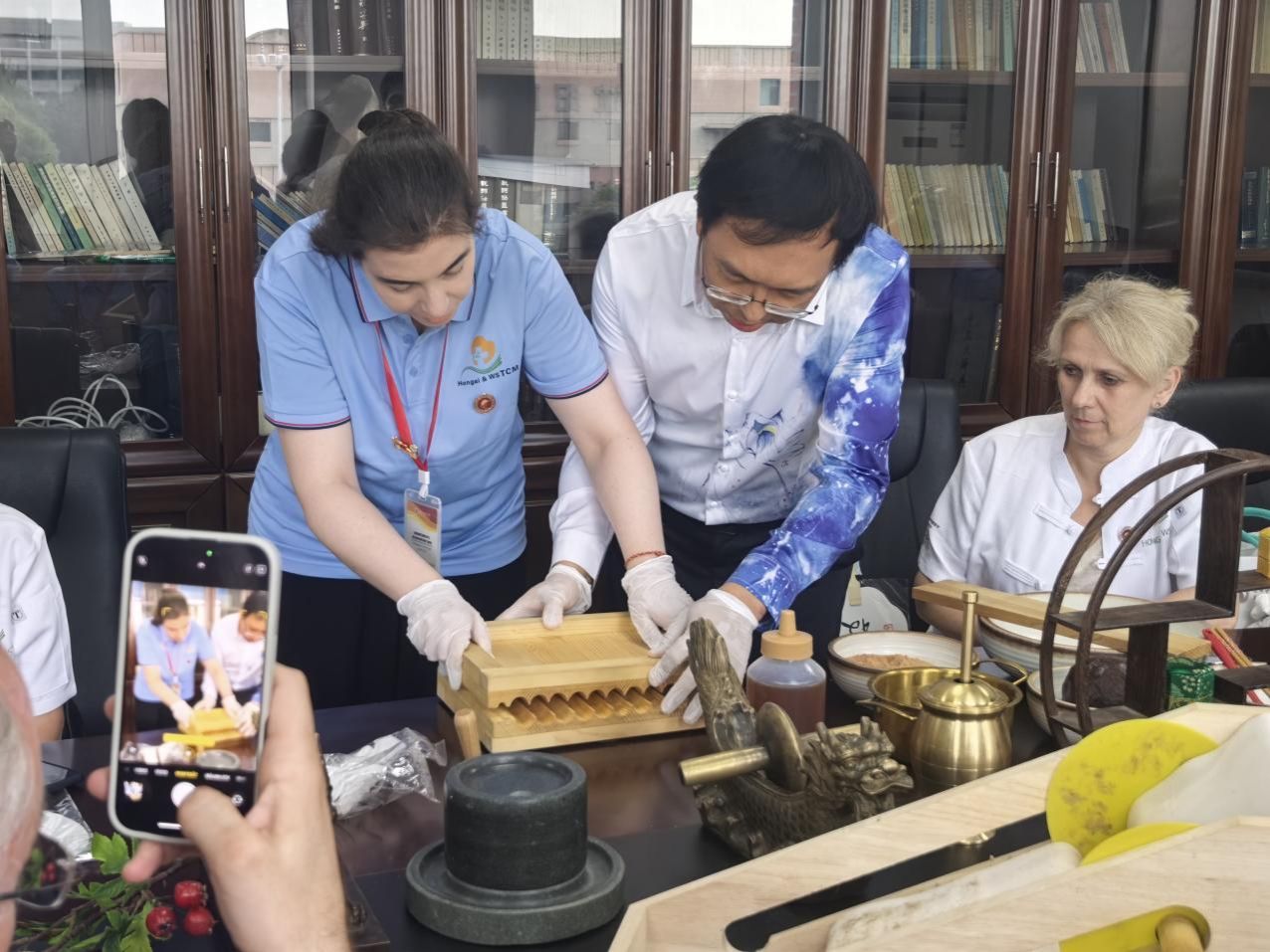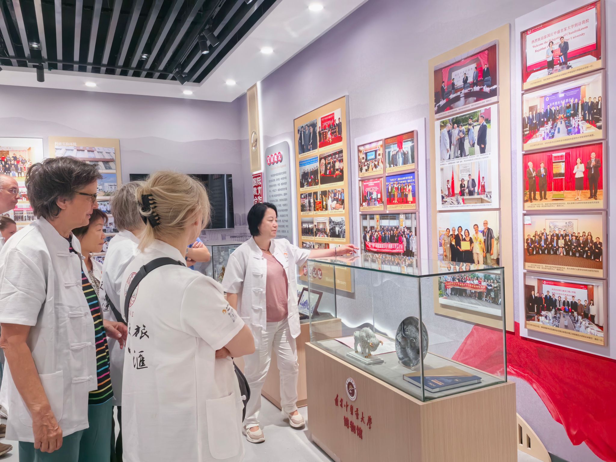 代表团一行到学校附属医院及康复中心参观交流。附属医院党委书记吕静、院长肖景东、副院长刘宁等接待了代表团。代表团与国医大师张静生面对面交流,学习中医诊断治疗方法。代表团参观了传统与现代疗法中心,体验了中医特色疗法,对中医药有了更直观的感受和更深入的了解。