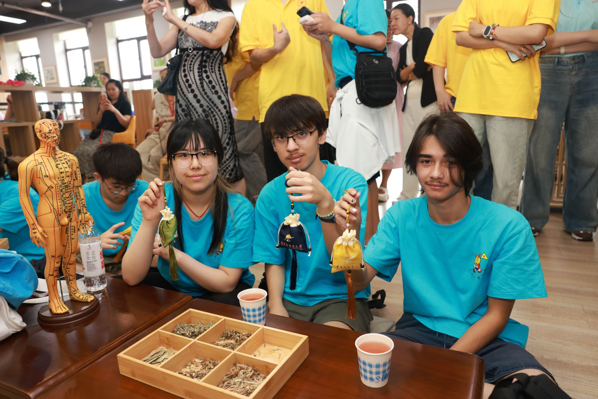 本次活动的一大亮点是海外华裔青少年夏令营成员与百余名沈阳市中小学生欢聚一堂,共同参与中医药文化体验活动。在专业老师的指导下,同学们兴致盎然地体验了传统中药香囊的制作。