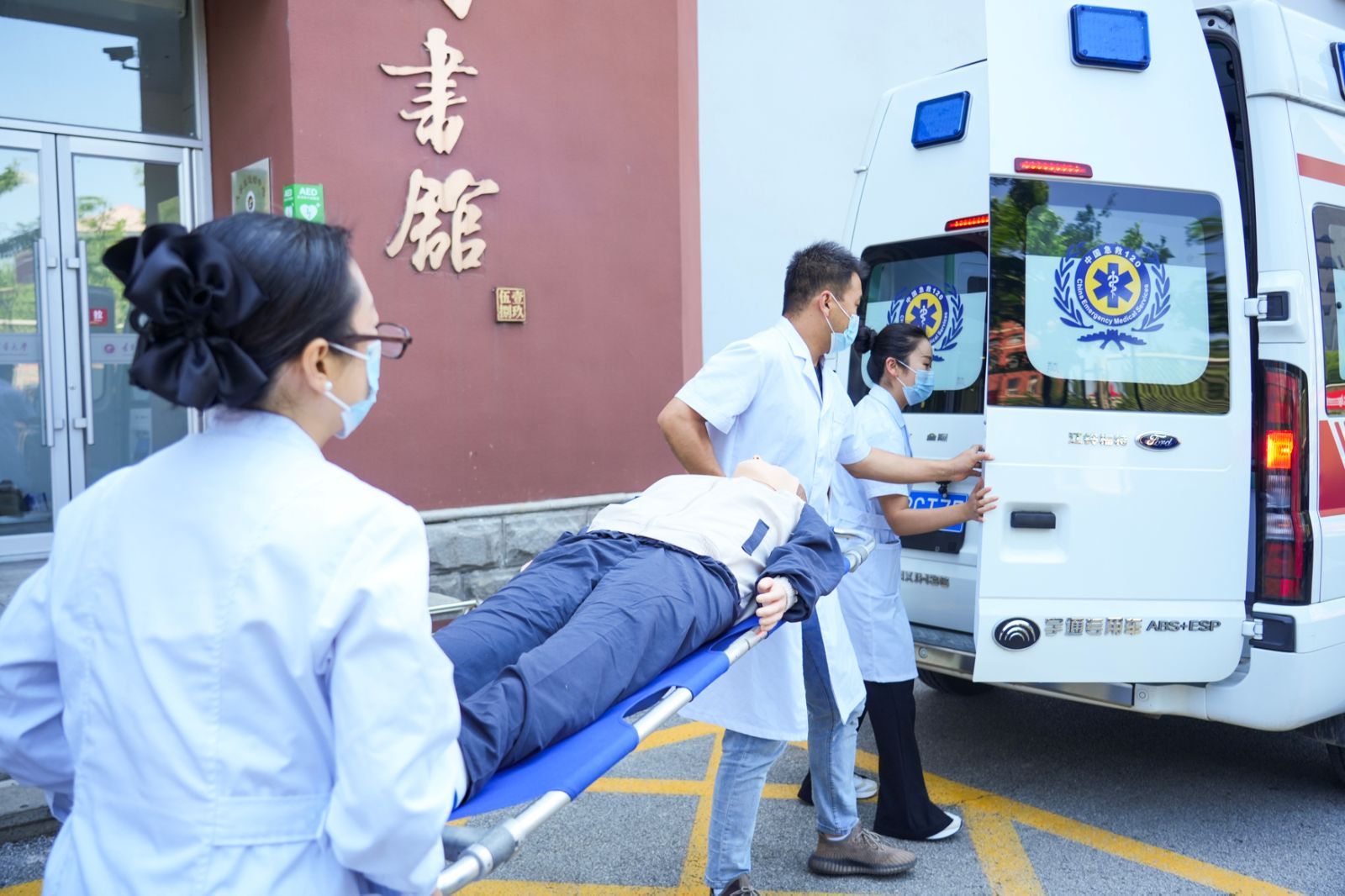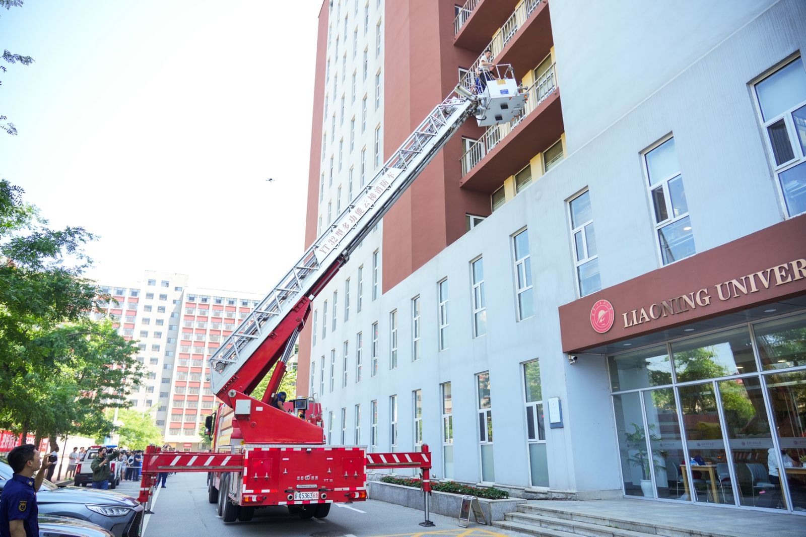 在消防救援环节,皇姑区消防救援大队抵达现场展开救援。消防员们动作娴熟地操作消防设备进行现场灭火,利用救援云梯对“被困”在高层的师生进行救援,学校门诊部工作人员也在第一时间对“受伤”人员进行紧急救治,整个救援过程紧张有序,展示了救援队伍的专业素养和快速反应能力。